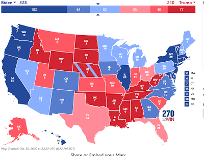 Wisconsin is supposedly turning to Biden, but I don't see it. Biden has hinted at more lockdowns and while the 'Rona is on the rampage in my home state, most people there don't want to be locked down all winter. The 17-point Biden lead reported recently is clearly crap. If it were true, Trump wouldn't be visiting Wisconsin, but he will be in Green Bay tomorrow.